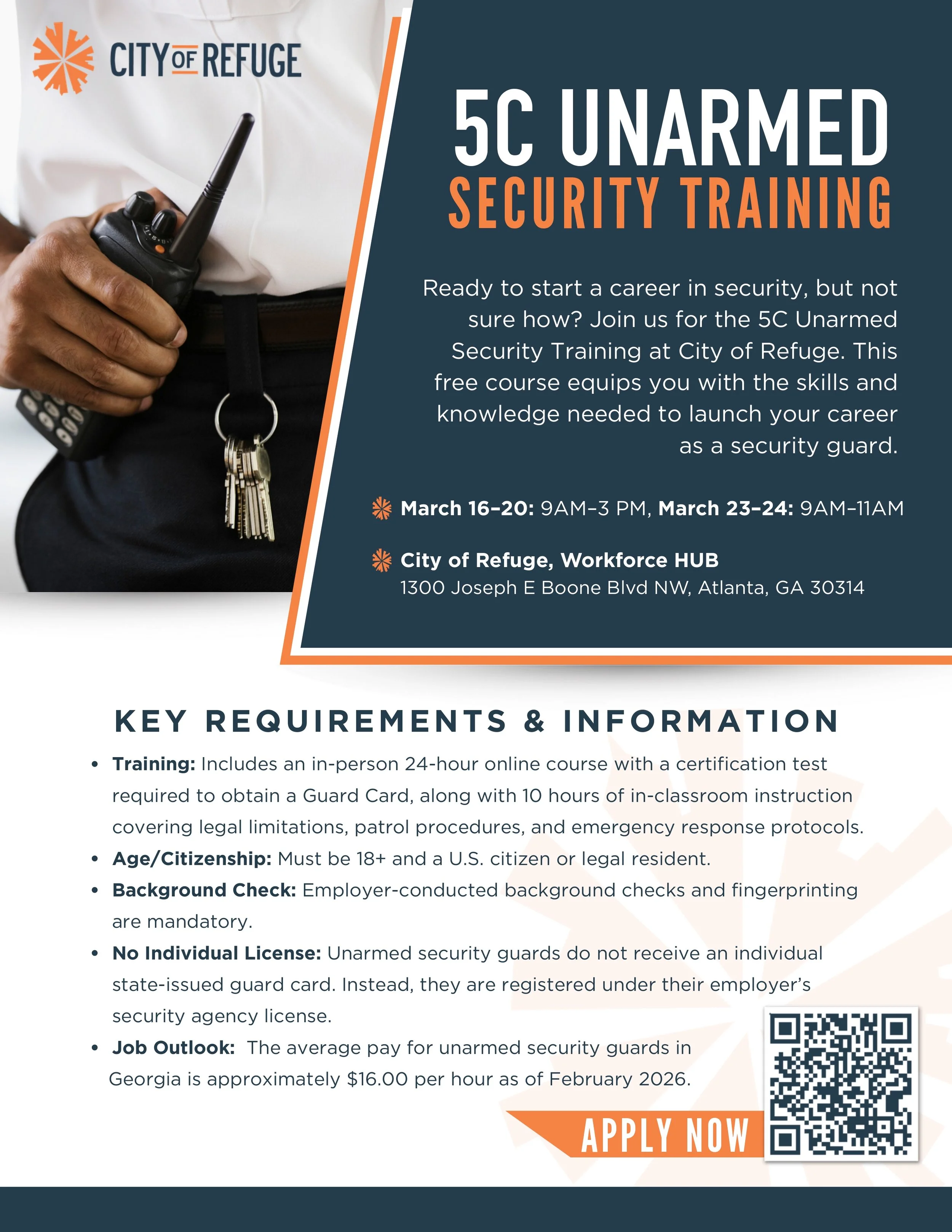Join us for hands-on security training designed to prepare you for entry-level roles in the field. This tuition-free program equips you with the skills, knowledge, and certifications needed to begin a career as an unarmed security guard. Limited spots available.